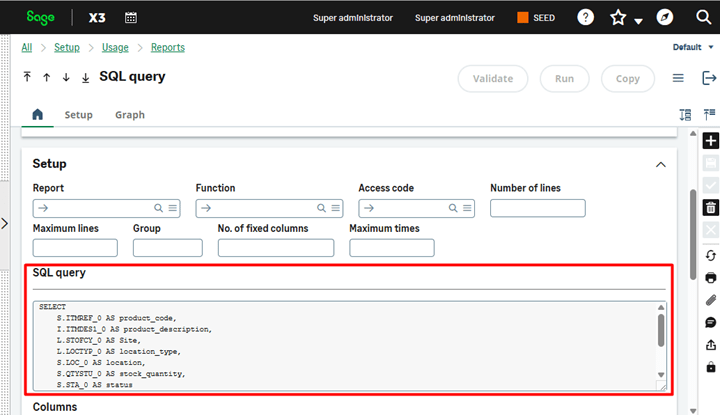 Using this utility allows you to create, save, and execute custom SQL queries within Sage X3, without the need for external database tools like SQL Server Management Studio.