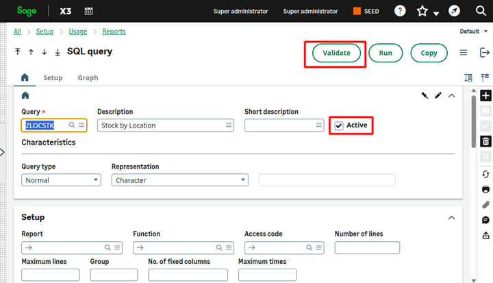 Check the Activate checkbox and then save the query. After it’s saved, click the Validate button. After validation is complete, the query is ready to use. It can be tested using the Run button.