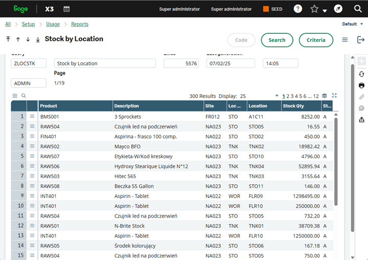 This is an example of a real-life request from a customer using Sage X3 for a global list of all products in stock by locations (bins). We built a Sage X3 stock report query to fulfill their request.