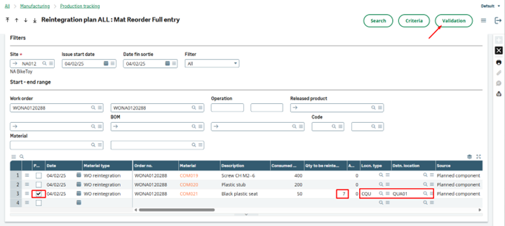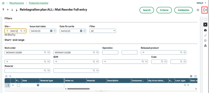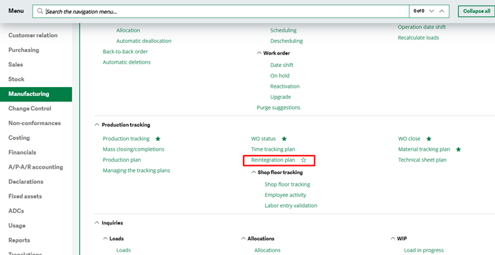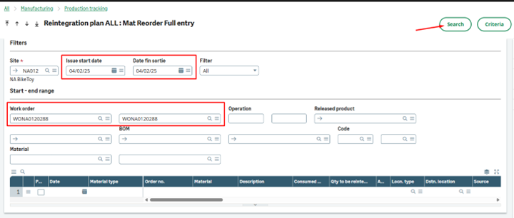 1. Open function Manufacturing > Production Tracking > Reintegration plan.