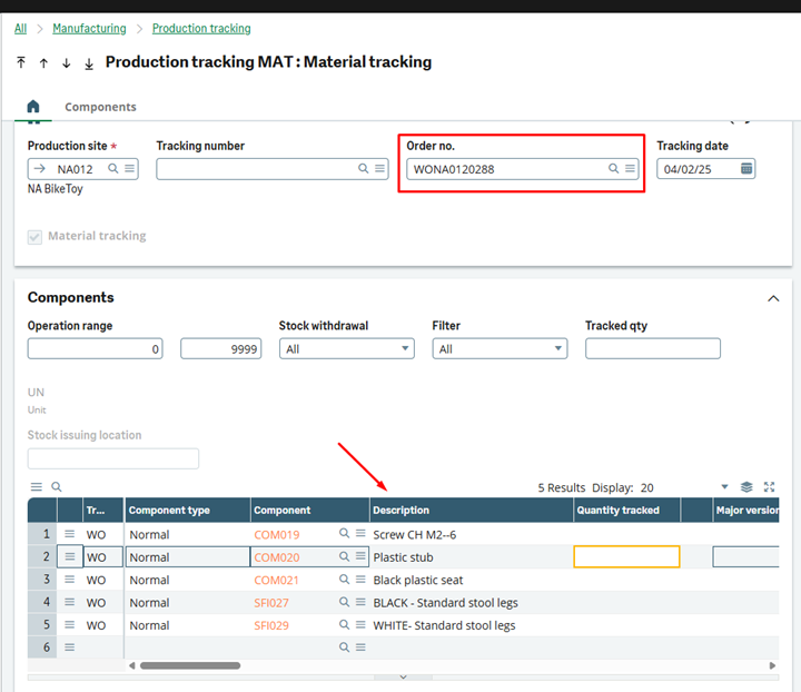 4. Enter the WO number in the Order no. field and click on the Components tab. The Components grid will populate with components.