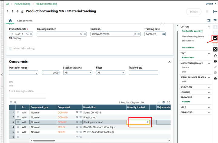 5. Locate the line with the part of replace. Enter the replacement quantity in the Quantity tracked field, and then click the Crate (tick) button.