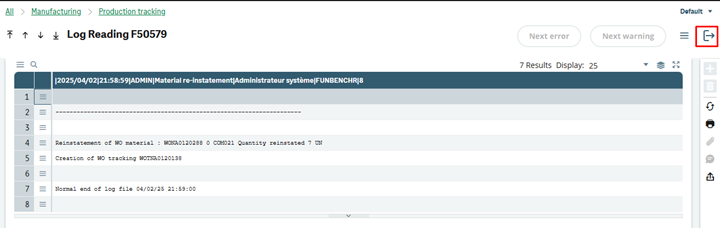6. Check information on the Log Reading screen and click the Exit (right arrow) button.