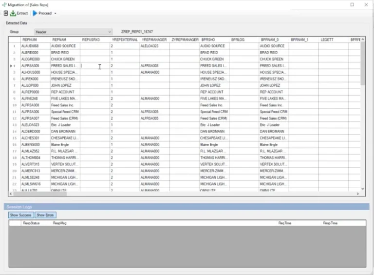 Our tool opens a new screen where we can extract data and transfer it into our middleware. During this step, we have can modify data before finalizing the migration. After completing any necessary modifications, we will click “Processed” to continue.